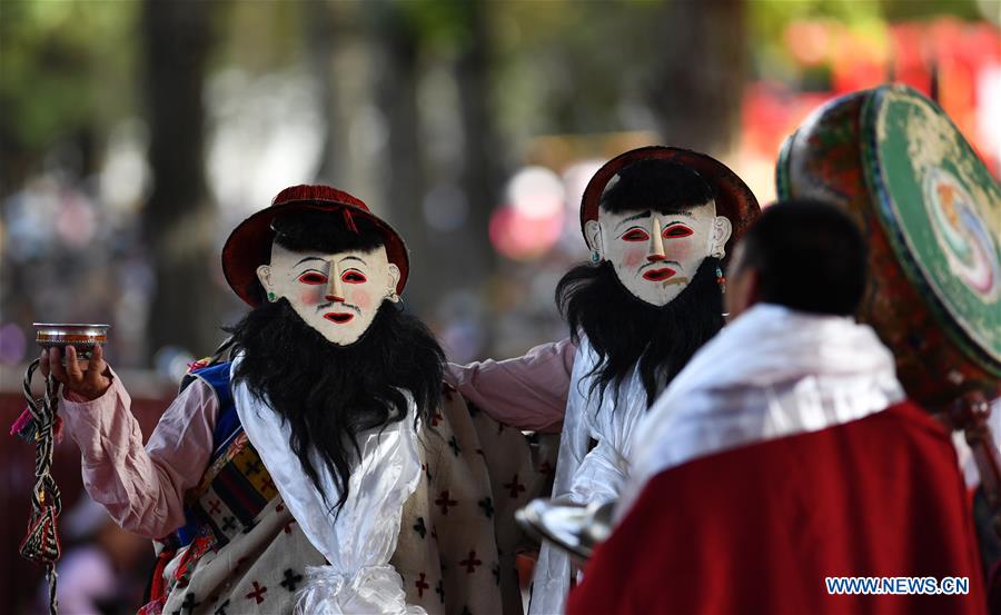 Masked Buddhist monks perform during an annual Cham dance event to pray for good harvest and peaceful life at the Tashilhunpo Monastery in Xigaze, southwest China's Tibet Autonomous Region, Sept. 22, 2020. (Xinhua/Chogo)