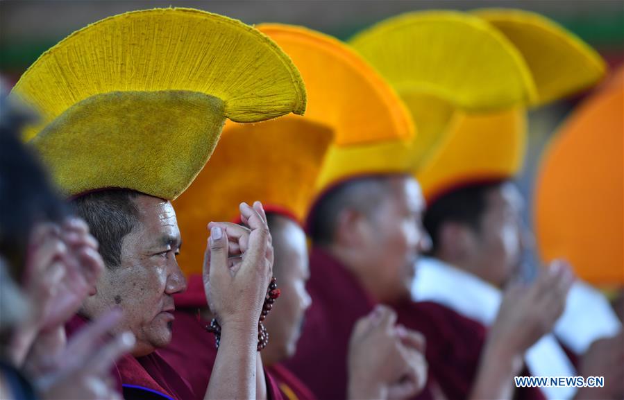 Buddhist monks attend an annual Cham dance event to pray for good harvest and peaceful life at the Tashilhunpo Monastery in Xigaze, southwest China's Tibet Autonomous Region, Sept. 22, 2020. (Xinhua/Chogo)