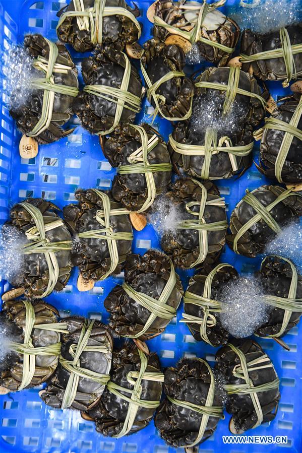 Photo taken on Sept. 23, 2020 shows bound crabs to be packaged in Wuxing District of Huzhou, east China's Zhejiang Province. A crab-breeding base covering an area of 14,000 mu (about 933 hectares) ushered in harvest season recently in Wuxing. In recent years, some villages in Wuxing have been vigorously promoting industrial upgrading and established an association, so as to standardize and improve crab quality, facilitate ecological cultivation and boost villagers' income. (Xinhua/Xu Yu)