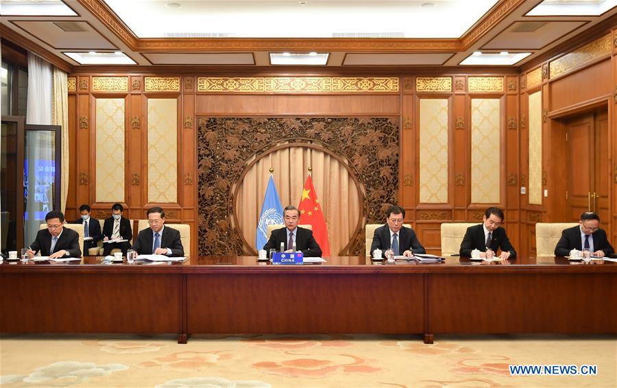 Wang Yi, special representative of Chinese President Xi Jinping, also Chinese state councilor and foreign minister, attends a video meeting of world leaders held by the UN Security Council in Beijing, capital of China, Sept. 24, 2020. (Xinhua/Li Xiang)