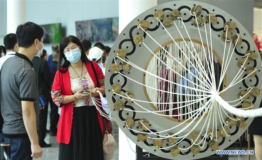 Visitors tour the exhibition area of the 8th China Taobao Village Summit Conference in Suning County, north China's Hebei Province, Sept. 26, 2020. The 8th China Taobao Village Summit Conference was held in Suning on Saturday. The Taobao Villages are rural e-commerce hubs that feature Alibaba's logistics, service and training to encourage farmers to engage in online sales of farm produce and local specialties. With 17 Taobao Villages and 9 Taobao Towns, Suning has a total of over 21,000 e-commerce online stores, achieving a yearly revenue of nearly 10 billion yuan (about 1.47 billion U.S. dollars). (Xinhua/Zhu Xudong)
