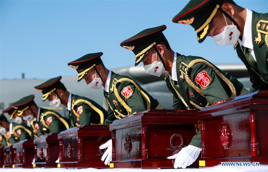 Chinese soldiers prepare to carry to a plane coffins containing remains of Chinese soldiers killed in the 1950-53 Korean War during a repatriation ceremony at Incheon International Airport in Incheon, the Republic of Korea (ROK), Sept. 27, 2020. The remains of 117 Chinese soldiers killed in the 1950-53 Korean War were returned to China on Sunday from the ROK. It is the seventh such repatriation following a handover agreement signed by the two countries. (Xinhua/Wang Jingqiang)