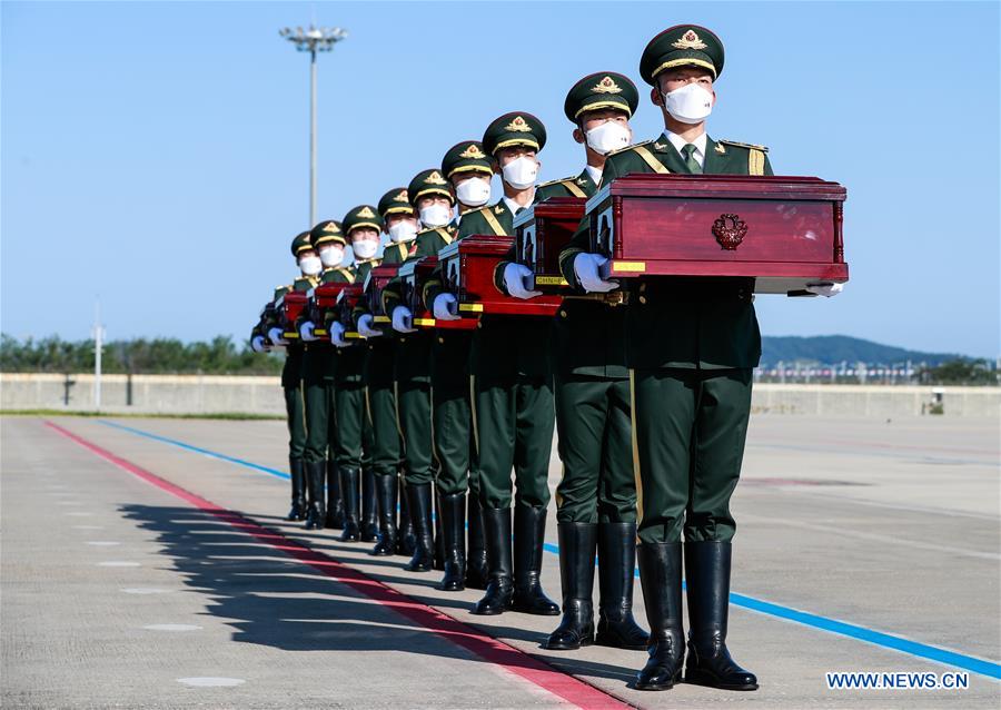 Chinese soldiers prepare to carry to a plane coffins containing remains of Chinese soldiers killed in the 1950-53 Korean War during a repatriation ceremony at Incheon International Airport in Incheon, the Republic of Korea (ROK), Sept. 27, 2020. The remains of 117 Chinese soldiers killed in the 1950-53 Korean War were returned to China on Sunday from the ROK. It is the seventh such repatriation following a handover agreement signed by the two countries. (Xinhua/Wang Jingqiang)