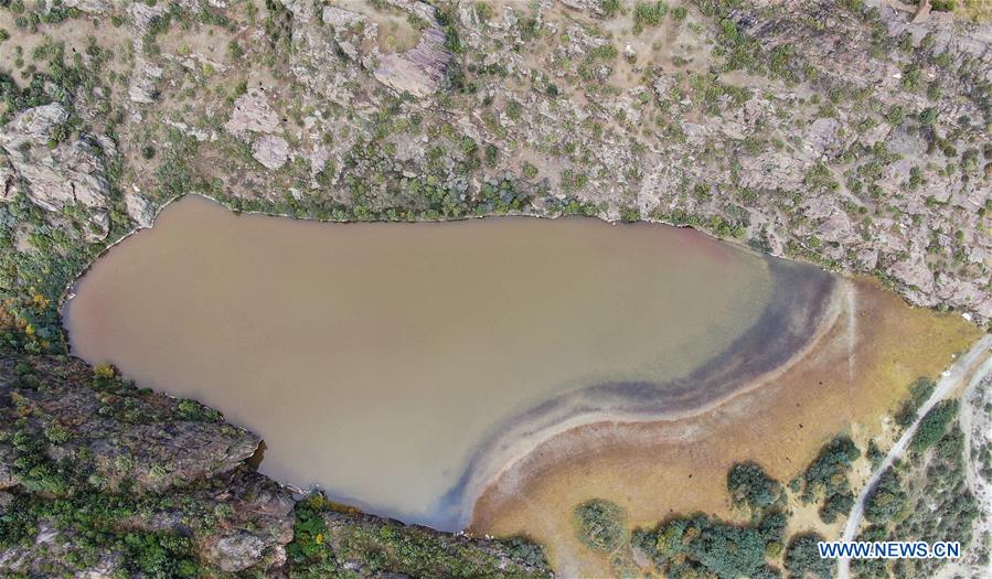 Photo taken with a drone shows the "yellow lake" of the "three-colored lakes" in Puyu Village of Banbar County, Qamdo, southwest China's Tibet Autonomous Region, Sept. 26, 2020. The "three-colored lakes" in Banbar County are comprised of three hill-seperated ponds which display black, white and yellow colors due to their varying depths and sediments. (Xinhua/Jigme Dorje)