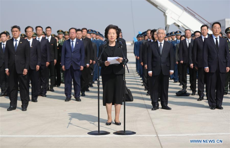 Chinese Vice Premier Sun Chunlan, also a member of the Political Bureau of the Communist Party of China Central Committee, speaks while attending a ceremony to welcome back the remains of 117 soldiers of the Chinese People's Volunteers sacrificed in the War to Resist U.S. Aggression and Aid Korea, at the Taoxian international airport in Shenyang, capital of northeast China's Liaoning Province, Sept. 27, 2020. (Xinhua/Yang Qing)