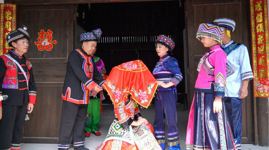 Photo shows a traditional Tujia ethnic group wedding ceremony at the Nv’erhui Festival in Baiyangping Town, Enshi Tujia and Miao Autonomous Prefecture, central China''s Hubei Province, Aug. 29, 2020. (People’s Daily Onilne/Zeng Zhiqiang)