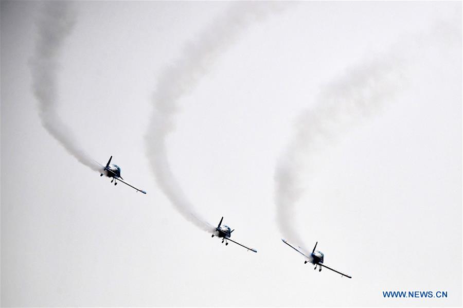 Enthusiasts in air sports give an aerobatic show during the opening of the 12th Air Sports Culture and Tourism Festival in Anyang, central China's Henan Province, Sept. 29, 2020. The event kicked off Tuesday and will last till Oct. 5. (Xinhua/Feng Dapeng)