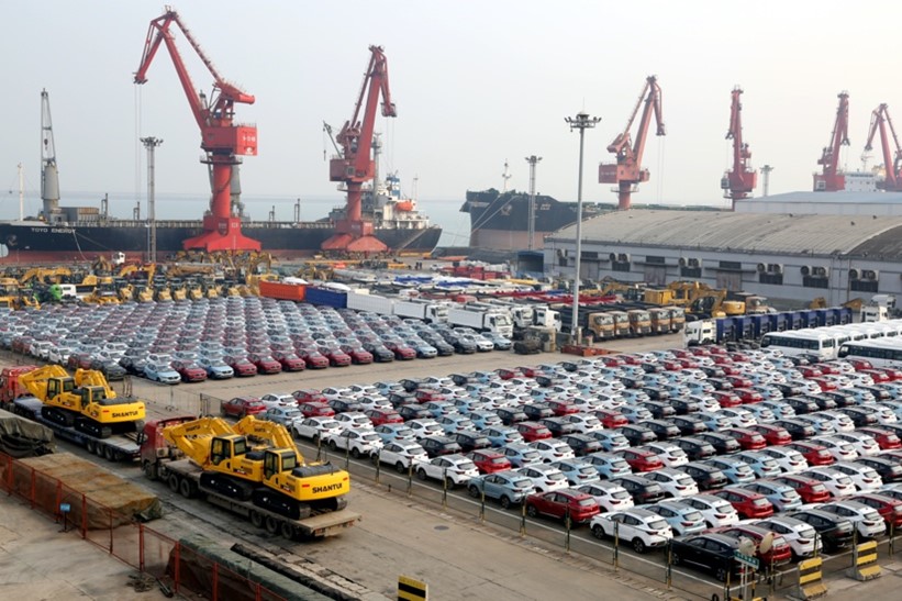 Automobiles and machineries are parked at a terminal in Lianyungang Port, east China’s Jiangsu province, waiting to be exported, Jan. 17. (Photo by Wang Chun, People’s Daily Online)