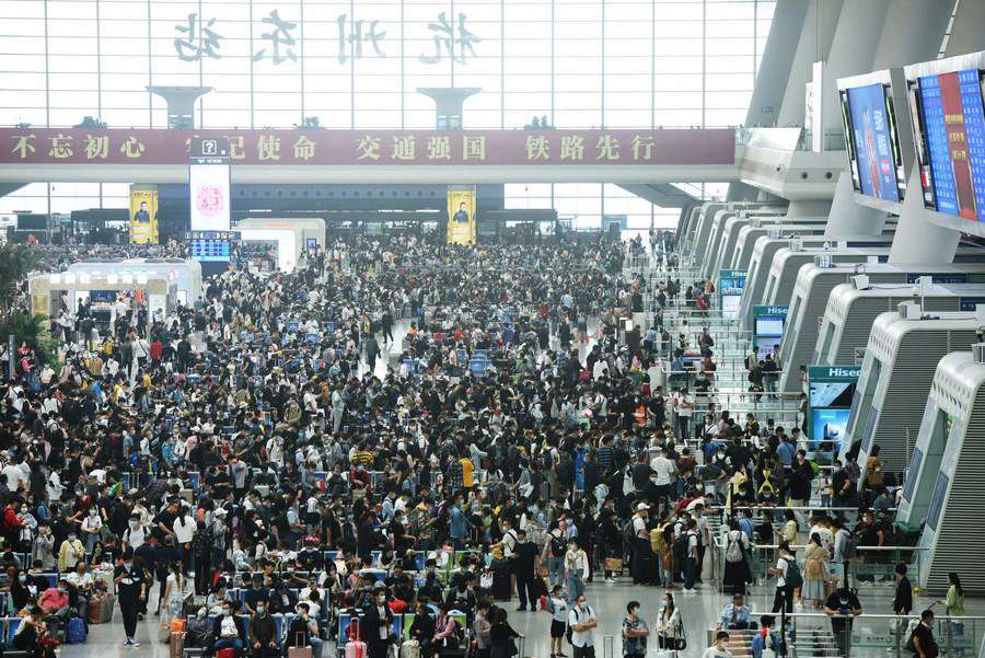 Aerial photo taken on Oct. 8, 2020 shows passengers preparing to enter Wuhan Railway Station in Wuhan, central China's Hubei Province. (Photo by Zhao Jun/Xinhua)