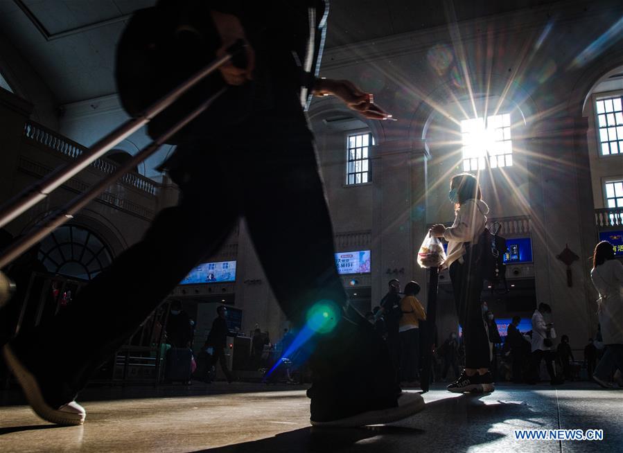 Passengers enter Hankou Railway Station in Wuhan, central China's Hubei Province, Oct. 8, 2020. Hankou Railway Station on Thursday witnessed a peak of return passengers, with 80,000 train trips expected as the eight-day holiday ended. China celebrates its National Day on Oct. 1, and the weeklong holiday this year has been extended to Oct. 8 as it overlapped with the Mid-Autumn Festival, a traditional festival symbolizing family reunion that falls on Aug. 15 on the lunar calendar. (Xinhua/Xiao Yijiu)