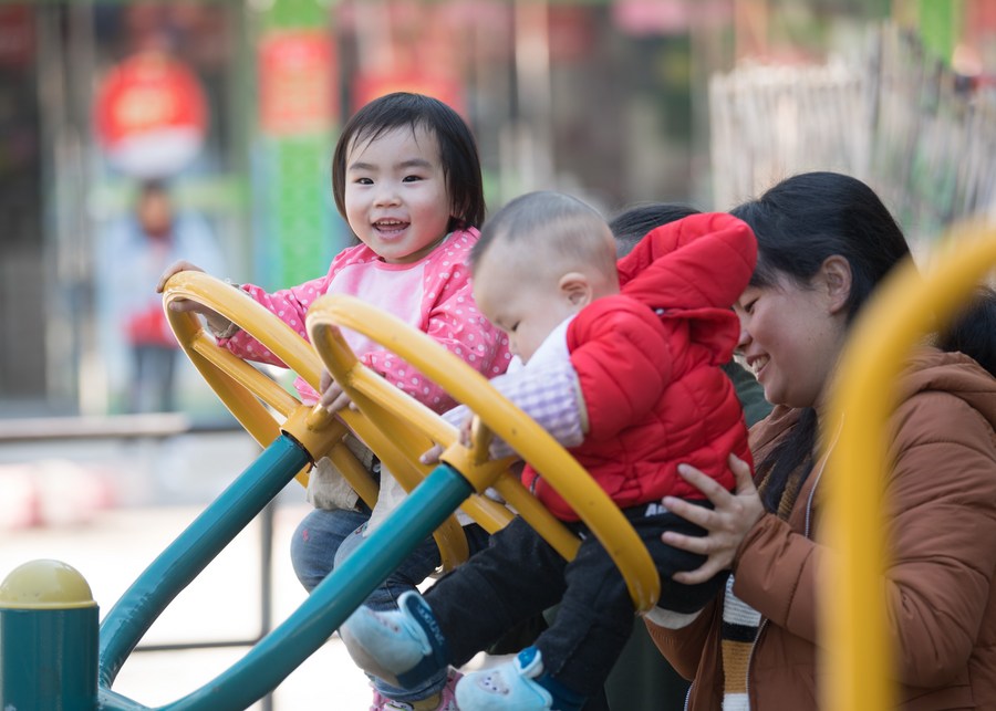 Two children play on the public fitness facility in Qiyi Village of Yiwu City, east China's Zhejiang Province, Nov. 28, 2017. (Xinhua/Weng Xinyang)
