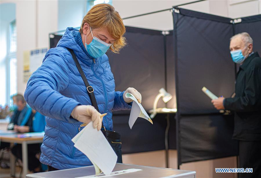 A voter casts her ballot at a polling station for the parliamentary elections in Vilnius, Lithuania, Oct. 11, 2020. The first round of the Lithuanian parliamentary elections began here on Sunday to elect 141 members of the Baltic country's parliament for a four-year term. (Photo by Alfredas Pliadis/Xinhua)