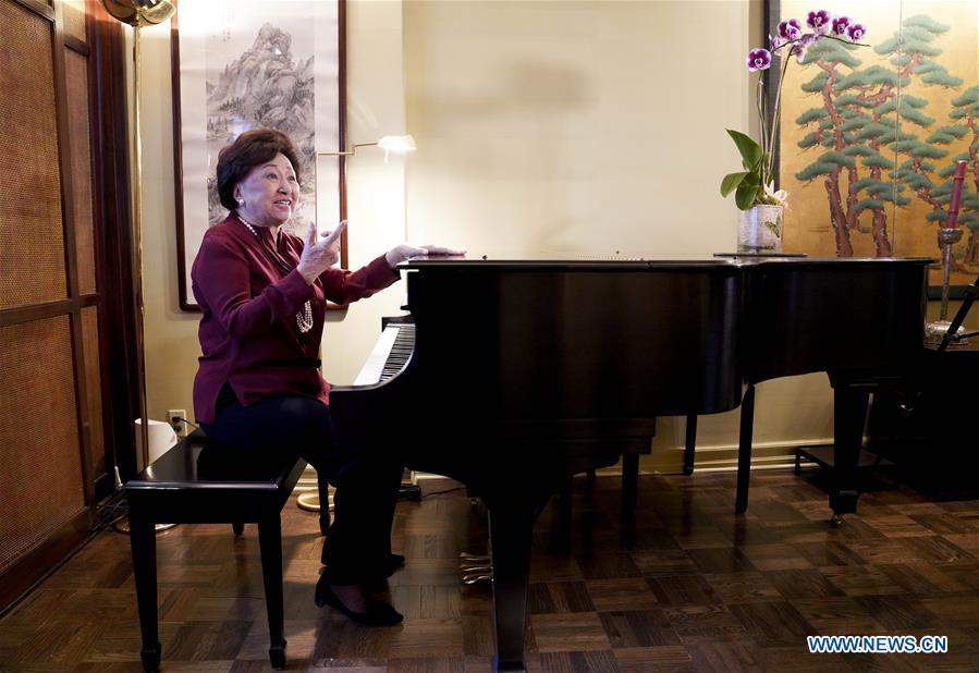 Retired Chinese American entrepreneur Shirley Young talks after playing the piano during an interview at her apartment in New York, the United States, March 6, 2020. When it comes to building cultural bridges between the United States and China through music and art, retired Chinese American entrepreneur Shirley Young's passionate energy is so appealing that it seems she is not aged. (Xinhua/Wang Ying)