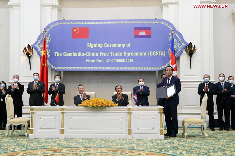 PHNOM PENH, Oct. 12 (Xinhua) -- China and Cambodia on Monday signed a free trade agreement (FTA) between the two countries.