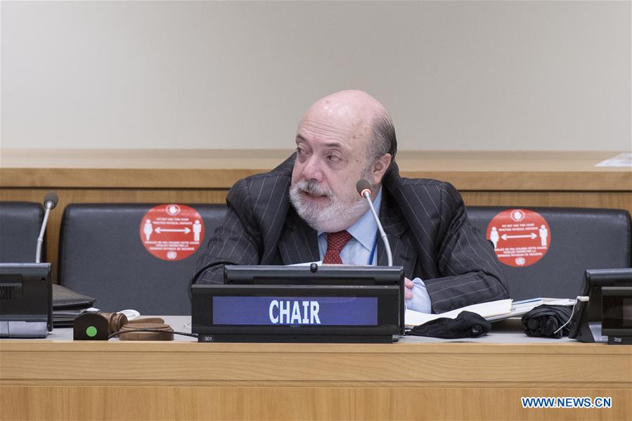 Carlos Daniel Amorin Tenconi, permanent representative of Uruguay to the United Nations, chairs a meeting of UN General Assembly (UNGA)'s Fifth Committee at the UN headquarters in New York, on Oct. 12, 2020. United Nations Secretary-General Antonio Guterres said on Monday that 2.99 billion U.S. dollars is needed in 2021 to fully implement the mandates entrusted to the organization. (Eskinder Debebe/UN Photo/Handout via Xinhua)