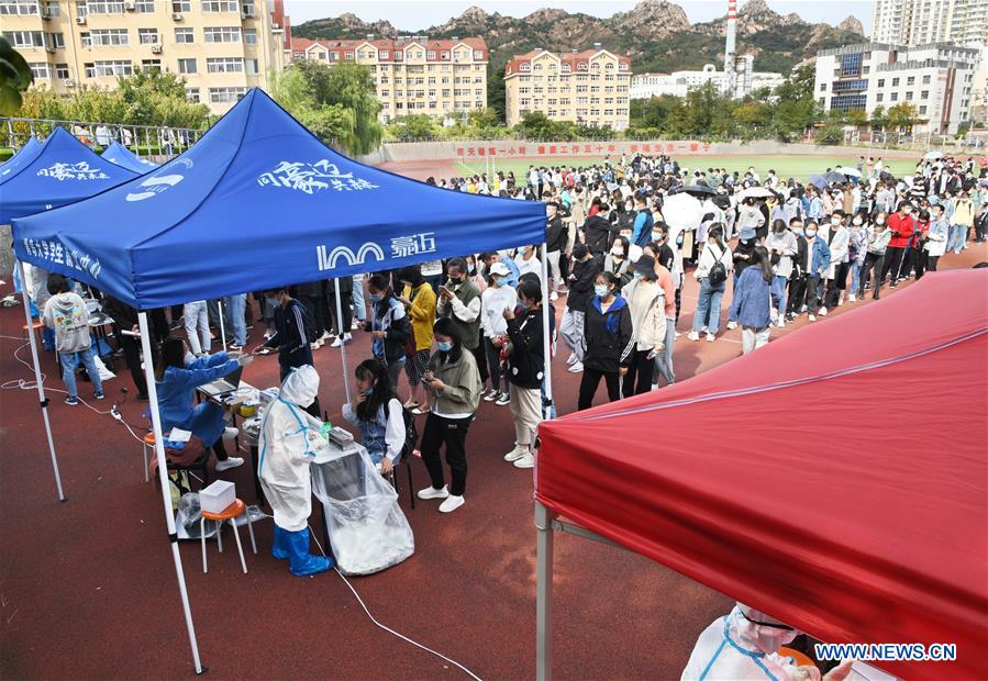 Students queue for COVID-19 tests at a stadium of Qingdao University in Qingdao, east China's Shandong Province, Oct. 13, 2020. Over 4 million people had been sampled for nucleic acid testing as of Tuesday afternoon after the city of Qingdao activated a plan to conduct city-wide testing on Monday. So far, about 1.95 million of the collected samples have been tested, and except for the confirmed and asymptomatic cases already reported, no new positive samples have been found. Qingdao had reported six new confirmed cases and six new asymptomatic cases of COVID-19 since fresh cases emerged in the city over the weekend, according to the local authorities. (Xinhua/Li Ziheng)