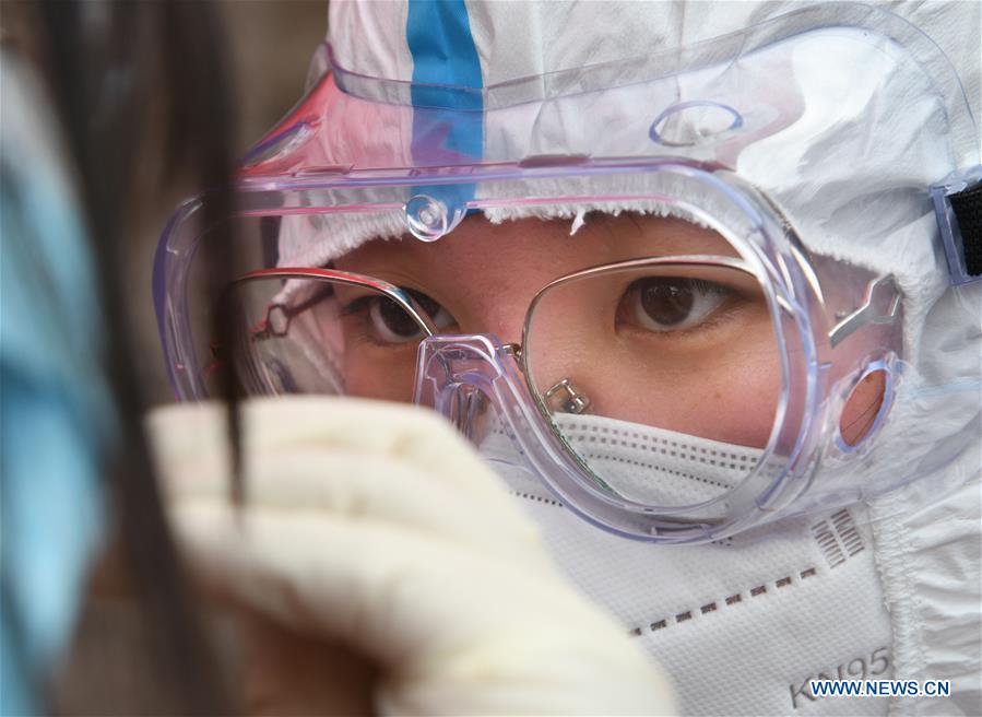 A health worker takes a swab sample from a student for COVID-19 test at a stadium of Qingdao University in Qingdao, east China's Shandong Province, Oct. 13, 2020. Over 4 million people had been sampled for nucleic acid testing as of Tuesday afternoon after the city of Qingdao activated a plan to conduct city-wide testing on Monday. So far, about 1.95 million of the collected samples have been tested, and except for the confirmed and asymptomatic cases already reported, no new positive samples have been found. Qingdao had reported six new confirmed cases and six new asymptomatic cases of COVID-19 since fresh cases emerged in the city over the weekend, according to the local authorities. (Xinhua/Li Ziheng)