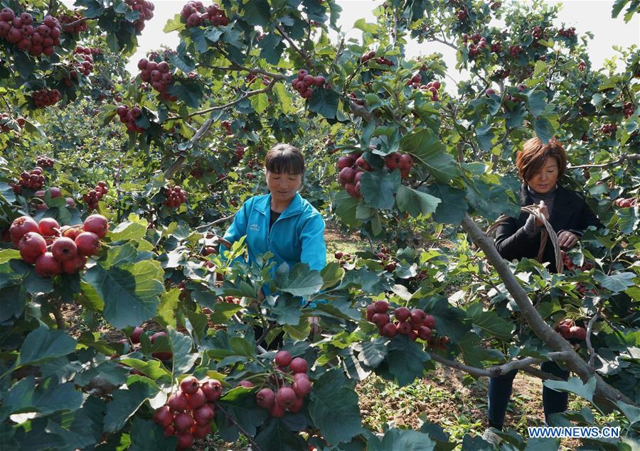Farmers harvest hawthorn fruits in Nanshan Village, Qinhuangdao City, north China's Hebei Province, Oct. 13, 2020. (Xinhua/Yang Shiyao)