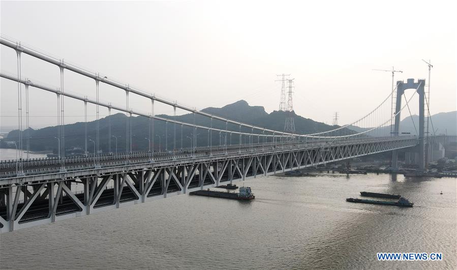 Aerial photo taken on Oct. 13, 2020 shows Wufengshan Yangtze River Bridge in east China's Jiangsu Province. The road-rail suspension bridge integrates an eight-lane expressway on the upper deck and a high-speed railway on the lower deck. The bridge has started the painting of the bridge body and installations of lights and other equipments to prepare for the traffic operation. (Photo by Meng Delong/Xinhua)