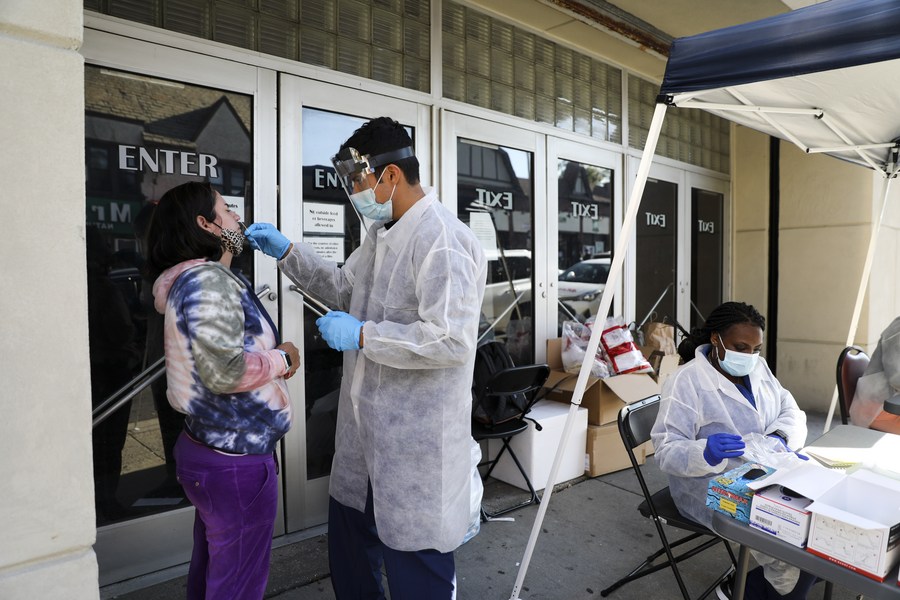 A woman gets COVID-19 test at a makeshift test site in Kew Gardens, one of the COVID-19 hotspot areas in New York City, the United States, Oct. 6, 2020. (Xinhua/Wang Ying)
