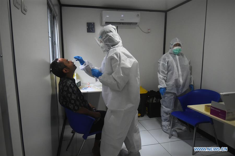 A medical worker wearing protective gear takes a sample from a man for COVID-19 test at a mini laboratory in Jakarta, Indonesia, Oct. 14, 2020. COVID-19 cases in Indonesia rose by 4,127 within one day to 344,749, with the death toll adding by 129 to 12,156, the Health Ministry said on Wednesday. (Xinhua/Zulkarnain)