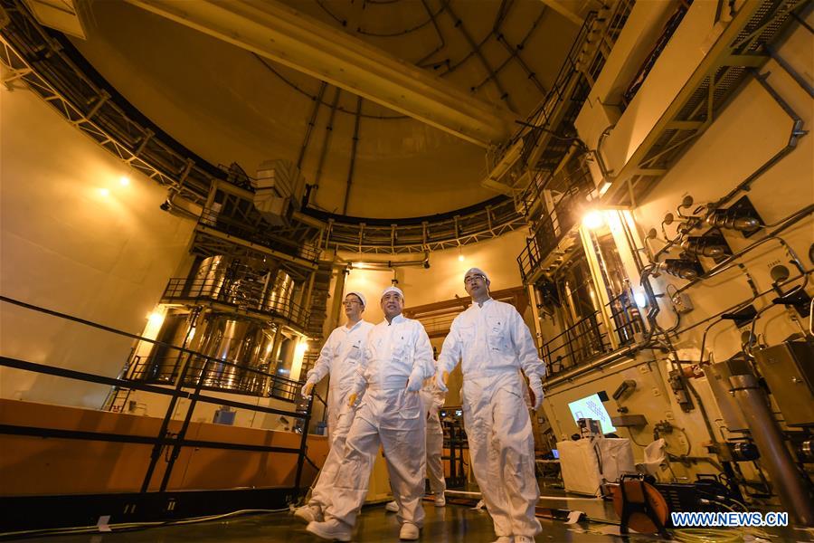 Qiao Sukai (C) and his team leave after finished their work at the Dayawan Nuclear Power Plant in Shenzhen, south China's Guangdong Province, April 12, 2019. Every 18 months, the Dayawan Nuclear Power Plant has to undergo a fuel assemblies replacement, which is one of the most important moments for the nuclear power plant. Dozens of engineers are divided into four shifts and operate the equipment day and night when the reactor is shut down. Their leader, Qiao Sukai, has been dealing with nuclear fuel since July 1993 when the nuclear fuel assembly of Dayawan Nuclear Power Plant arrived. The professional and technical maintenance team led by Qiao is responsible for the maintenance of nuclear fuel for more than half of the nuclear power units in the country. Qiao and his team have successfully operated fuel installing and uninstalling more than 170 times without making a single mistake. (Xinhua/Mao Siqian)