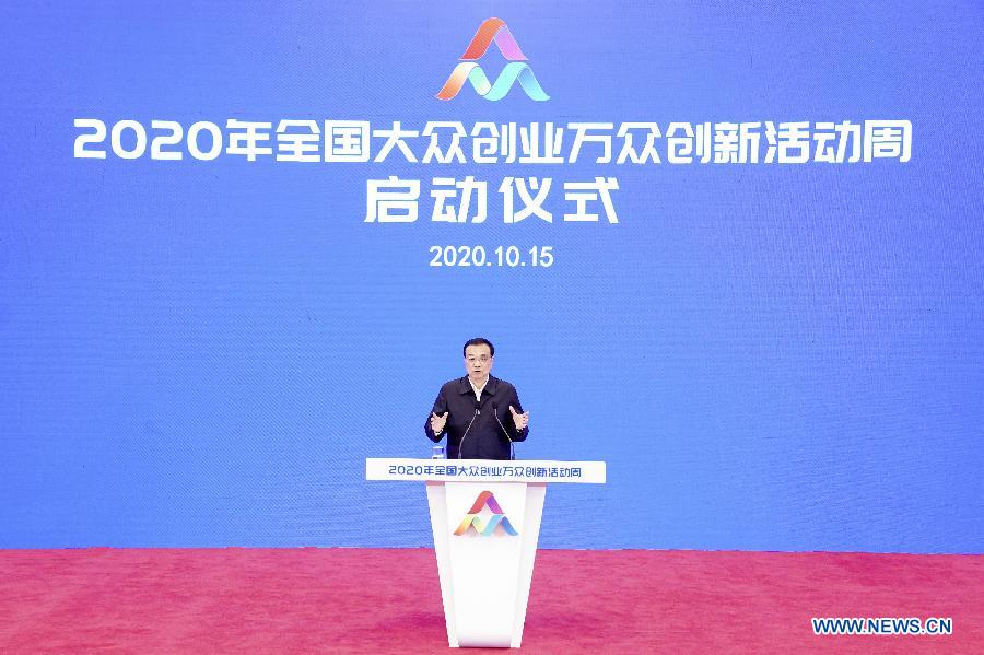 Chinese Premier Li Keqiang, also a member of the Standing Committee of the Political Bureau of the Communist Party of China Central Committee, addresses the opening ceremony of the 2020 National Mass Innovation and Entrepreneurship Week in Beijing, capital of China, Oct. 15, 2020. (Xinhua/Yin Bogu)