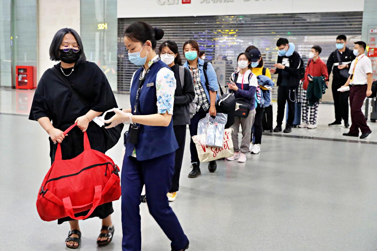 An airport employee checks students' travel documents. MO XIAOJIAN/FOR CHINA DAILY