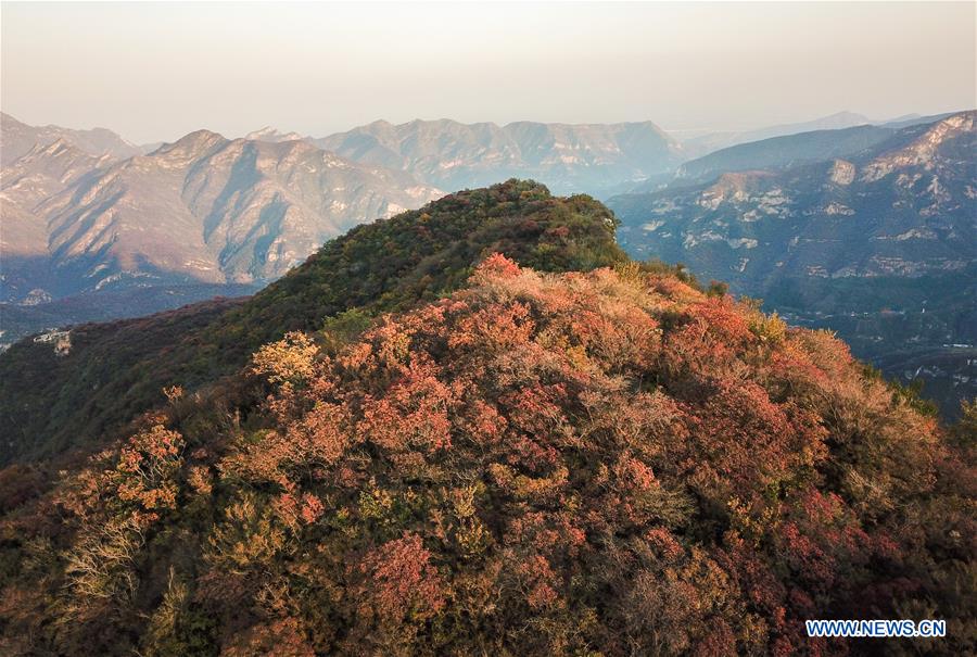 Aerial photo taken on Oct. 18, 2020 shows the autumn colors at Pofengling Scenic Area in Fangshan District of Beijing, capital of China. (Xinhua/Lyu Shuai)