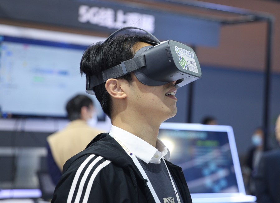 A visitor tries VR (Virtual Reality) glasses during the 2020 Global Industrial Internet Conference in Shenyang, capital of northeast China's Liaoning Province, Oct. 18, 2020. (Xinhua/Long Lei)