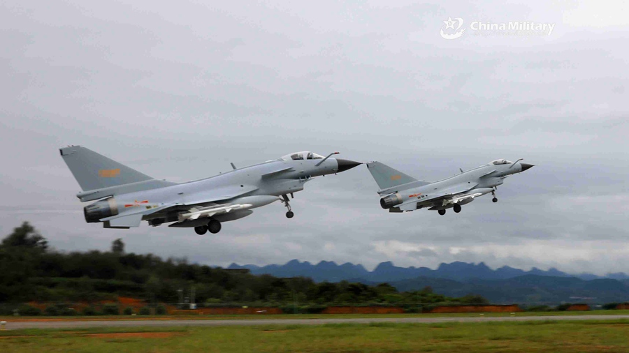Two J-10 fighter jets attached to an aviation brigade of the air force under the PLA Southern Theater Command take off simultaneously from the runway during a ferry flight training exercise on October 16, 2020. (eng.chinamil.com.cn/Photo by Gu Haodong)
