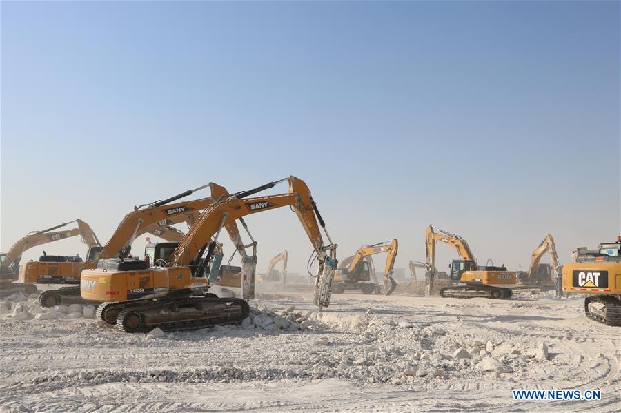 Construction machines work at the construction site of a project of China Gezhouba Group Corporation (CGGC) in desert of Jahra Governorate, Kuwait, Oct. 18, 2020. China Gezhouba Group Corporation (CGGC) handed over on Tuesday the first batch of its housing infrastructure project to the Kuwaiti side, injecting new momentum into Kuwait's economy and livelihood. (Photo by Liu Lianghaoyue/Xinhua)