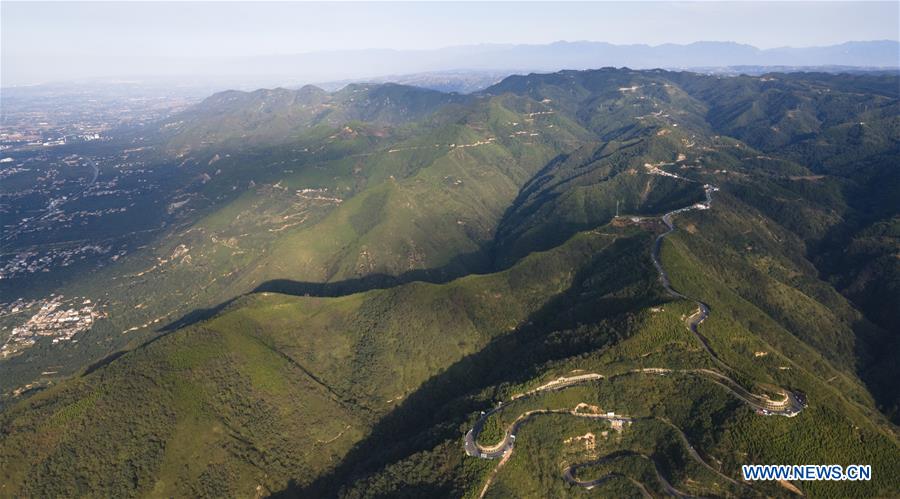 Aerial photo taken on Sept. 18, 2020 shows the scenery of Lishan Mountain in Xi'an, northwest China's Shaanxi Province. (Xinhua/Shao Rui)
