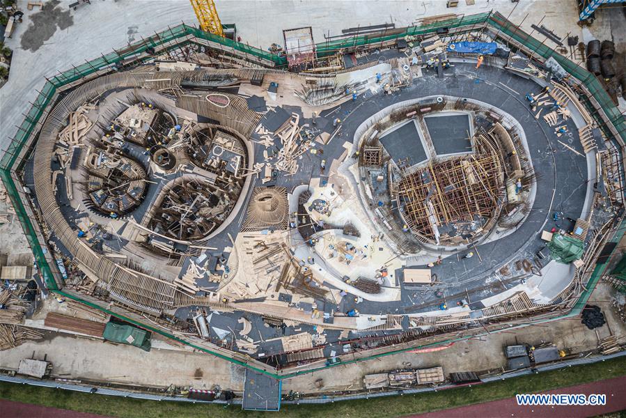 Aerial photo taken on Oct. 20, 2020 shows the construction site of the Wormhole Library in the Haikou Bay in Haikou, capital city of south China's Hainan Province. The Wormhole Library will be a landmark in the Haikou Bay after completion. (Xinhua/Pu Xiaoxu)