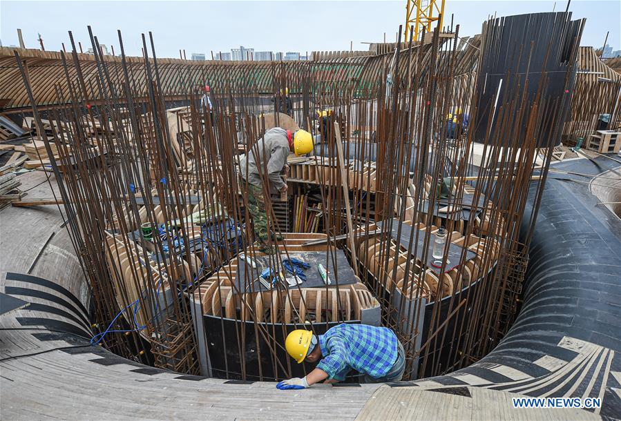 People work at the construction site of the Wormhole Library in the Haikou Bay in Haikou, capital city of south China's Hainan Province, Oct. 20, 2020. The Wormhole Library will be a landmark in the Haikou Bay after completion. (Xinhua/Pu Xiaoxu)