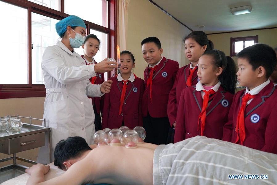 Pupils watch the demonstration of cupping therapy, a traditional Chinese method of healthcare, at a hospital in Neiqiu County, north China's Hebei Province, Oct. 21, 2020. Lessons on traditional Chinese medicine (TCM) were introduced to schools across the country to welcome the annual World Traditional Medicine Day which falls on Oct. 22. (Photo by Liu Jidong/Xinhua)