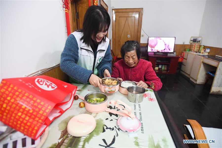 A volunteer (L) delivers food to an aged resident at Chilinglu community in Changsha, central China's Hunan Province, Oct. 21, 2020. A community kitchen has been established here since 2015 to provide affordable or gratis food for some senior people in need at the community. (Xinhua/Chen Zeguo)