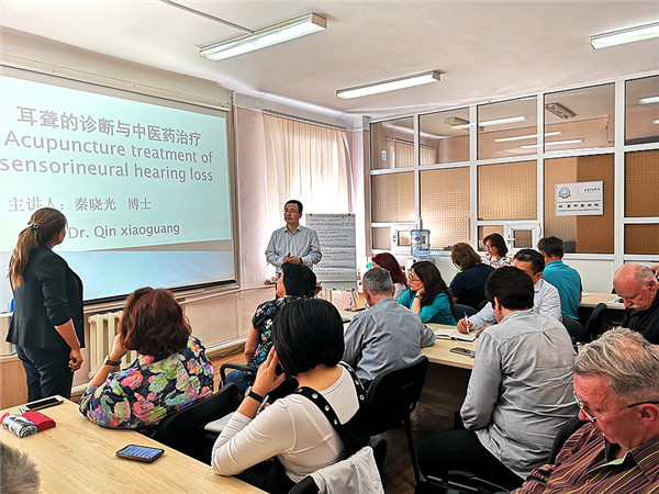 Dr Qin Xiaoguang from Gansu University of Chinese Medicine gives a lecture on TCM treatment in Ukraine.