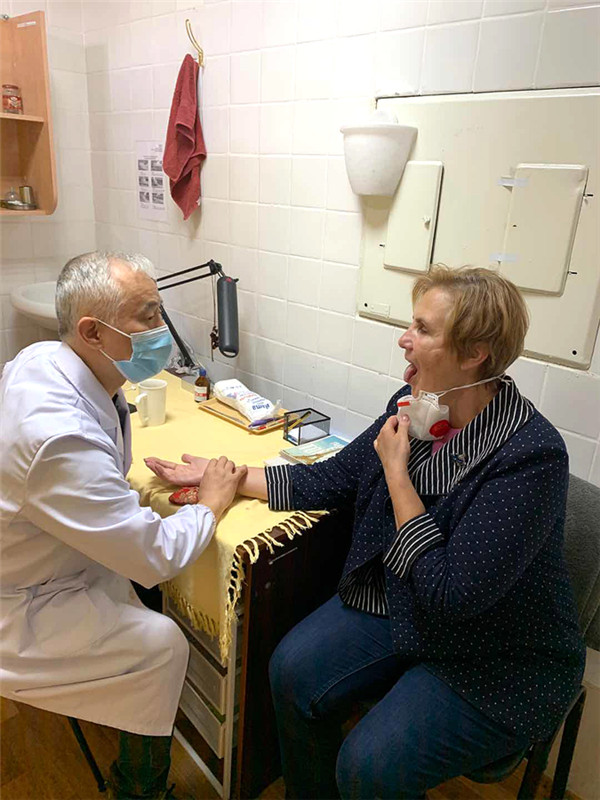Cui Wen, a TCM doctor from China, feels a patient’s pulse in a hospital in Kiev, Ukraine.