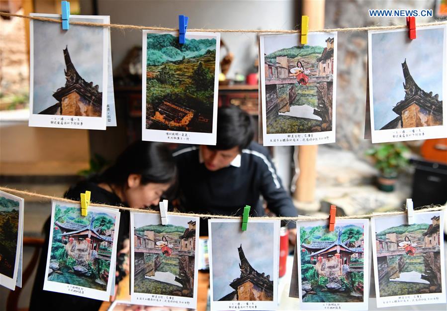 Photo taken on Oct. 21, 2020 shows the postcards made by Hu Wenliang, a professional designer introduced to Longtan Village who started a cultural and creative space here, together with his family, in Longtan Village of Pingnan County in Ningde City, southeast China's Fujian Province. Longtan Village had been a provincial-level poverty-stricken village due to lack of arable land. Villagers went out for work one after another with many old buildings left in disrepair. In 2017, the county government launched a project to boost ancient villages through cultural and creative industries. The old houses, once forgotten, have been connected to public utilities, reinforced and decorated inside, with the ancient appearance of the village remained. Moreover, the renaissance here has attracted many people and college graduates outside the village to work here. Nowadays, more and more people come to visit Longtan since the village has become popular on the Internet. (Xinhua/Wei Peiquan)
