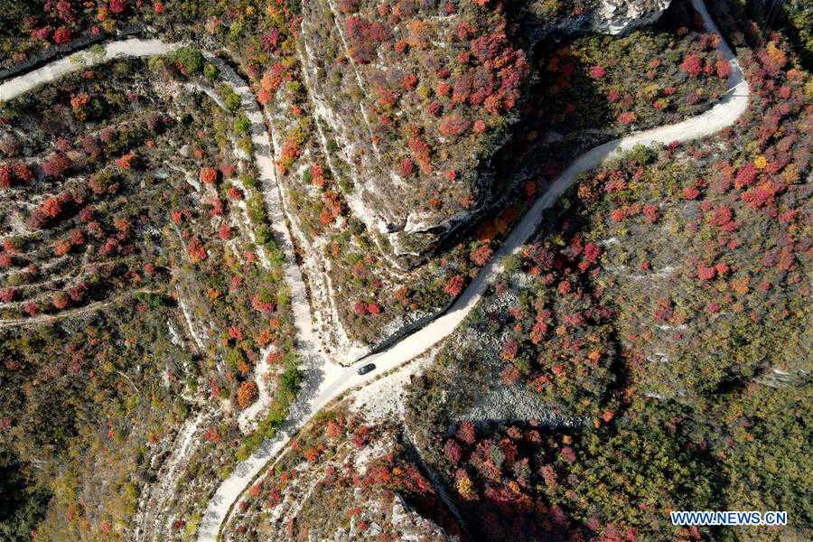 Aerial photo taken on Oct. 22, 2020 shows the scenery of red leaves in Hongfeng Mountain of Chaiguan Township in Shahe City, north China's Hebei Province. (Xinhua/Mu Yu)