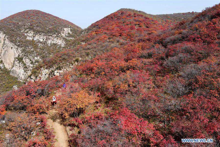 Aerial photo taken on Oct. 22, 2020 shows the scenery of red leaves in Hongfeng Mountain of Chaiguan Township in Shahe City, north China's Hebei Province. (Xinhua/Mu Yu)
