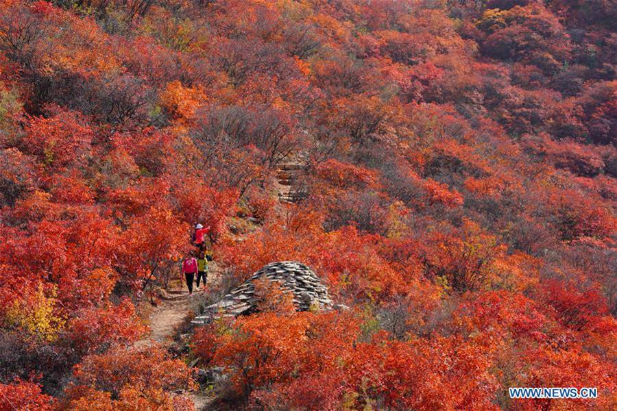 People enjoy the scenery of red leaves in Hongfeng Mountain of Chaiguan Township in Shahe City, north China's Hebei Province, Oct. 22, 2020. (Xinhua/Mu Yu)