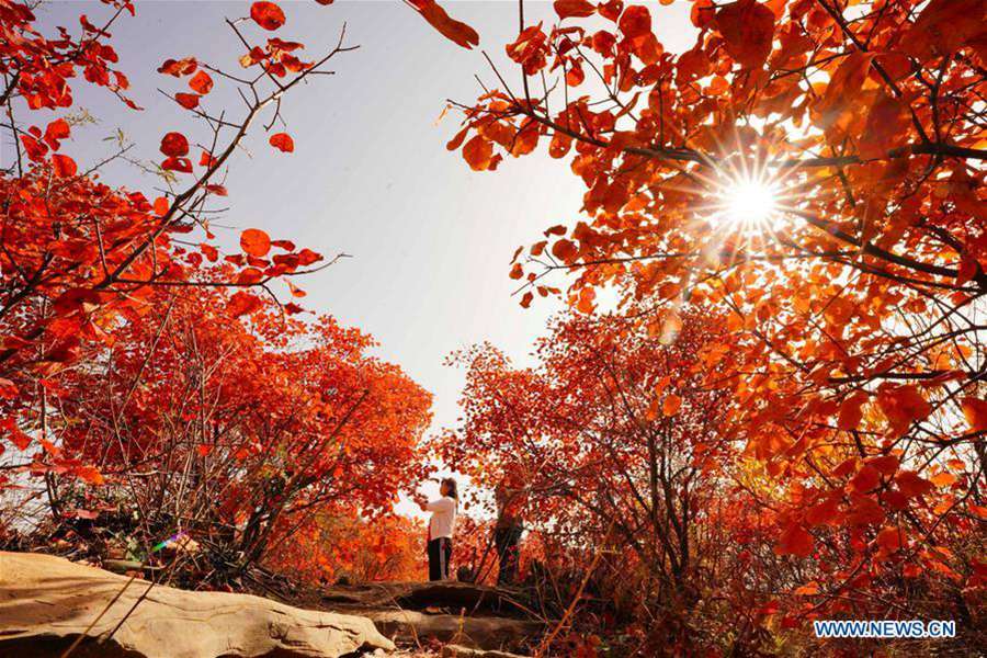 People enjoy the scenery of red leaves in Hongfeng Mountain of Chaiguan Township in Shahe City, north China's Hebei Province, Oct. 22, 2020. (Xinhua/Mu Yu)