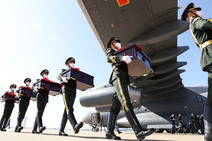 Chinese soldiers carry to a plane coffins containing remains of Chinese soldiers killed in the 1950-53 Korean War during a repatriation ceremony at Incheon International Airport in Incheon, the Republic of Korea (ROK), Sept. 27, 2020. (Xinhua/Wang Jingqiang)