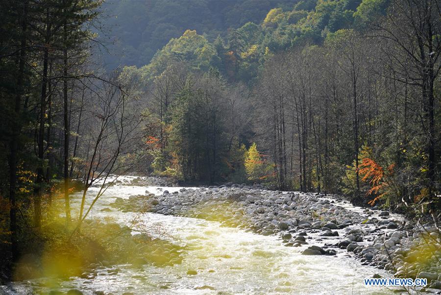 Photo taken on Oct. 16, 2020 shows a view of the Qinling Mountains in Houzhenzi Town of Xi'an, northwest China's Shaanxi Province. (Xinhua/Shao Rui)