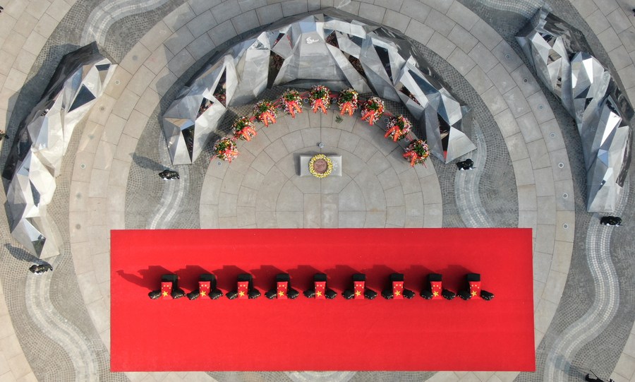 Aerial photo taken on Sept. 28, 2020 shows a burial ceremony of the remains of 117 Chinese soldiers killed in the 1950-53 Korean War at the Chinese People's Volunteers (CPV) martyrs' cemetery in Shenyang, northeast China's Liaoning Province. (Xinhua/Yang Qing)