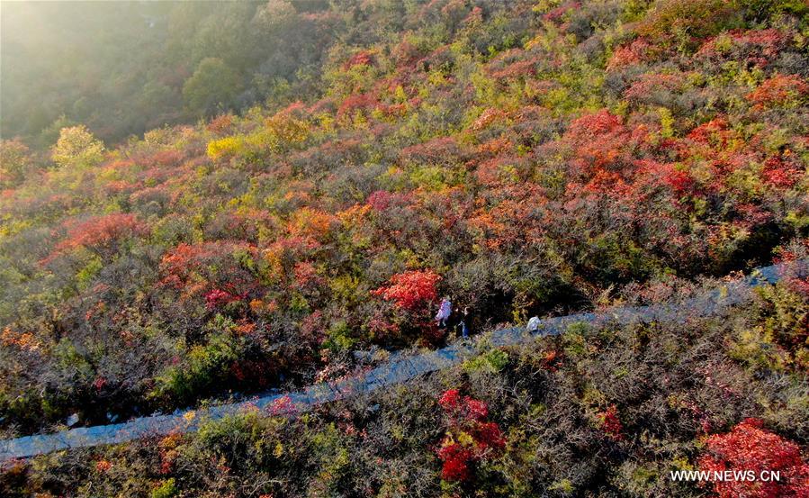 Aerial photo taken on Oct. 22, 2020 shows the autumn scenery of Qingtianhe scenic area in Boai County of Jiaozuo City, central China's Henan Province. (Xinhua/Hao Yuan)