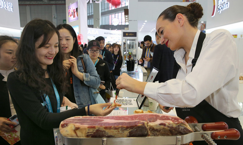 Photo taken on Nov. 10, 2019, shows visitors line up to taste Spanish ham in the Food and Agricultural Products exhibition area of the 2nd CIIE. (Photo by Xu Congjun/People’s Daily Online)