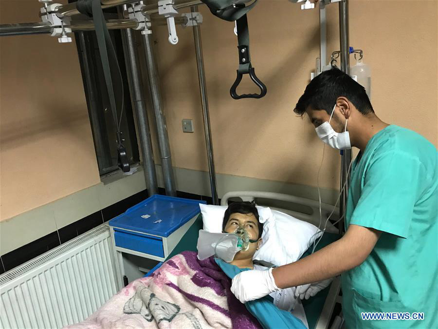 A man injured in a suicide attack receives medical treatment in a local hospital in Kabul, capital of Afghanistan, Oct. 24, 2020. At least 11 people were killed and over 20 others wounded in a suicide bomb blast rocking outside an education center in a western neighborhood of Afghanistan's capital of Kabul on Saturday, the local police said. (Photo by Rahmatullah Alizadah/Xinhua)